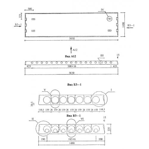 Плиты длиной 5650 мм и шириной 1490 мм с напрягаемой арматурой из стали классов A-IIIв, A-IV, Ат-V связевые, рядовые, из тяжелого бетона. Метод натяжения - электротермический.